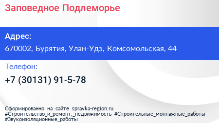 Заповедное Подлеморье по адресу 670002, Бурятия, Улан-Удэ, Комсомольская, 44 в дальнейшем Организация, размещена в следующих категориях: