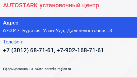 AUTOSTARK, установочный центр по адресу 670047, Бурятия, Улан-Удэ, Дальневосточная, 3 в дальнейшем Организация, размещена в следующих категориях: