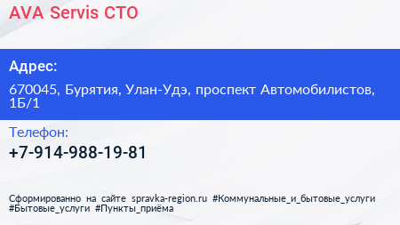 AVA Servis, СТО по адресу 670045, Бурятия, Улан-Удэ, проспект Автомобилистов, 1Б/1 в дальнейшем Организация, размещена в следующих категориях: