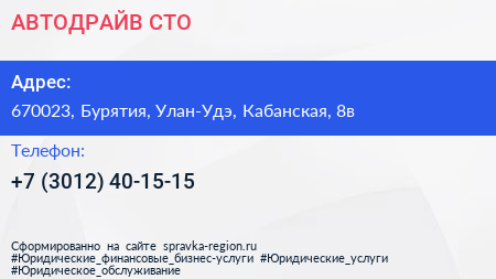 АВТОДРАЙВ, СТО по адресу 670023, Бурятия, Улан-Удэ, Кабанская, 8в в дальнейшем Организация, размещена в следующих категориях: