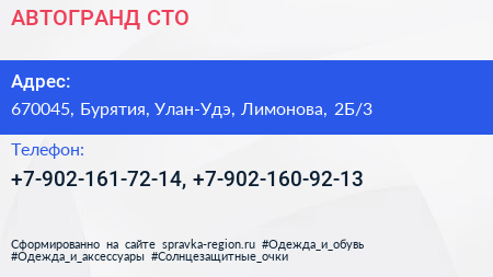 АВТОГРАНД, СТО по адресу 670045, Бурятия, Улан-Удэ, Лимонова, 2Б/3 в дальнейшем Организация, размещена в следующих категориях: