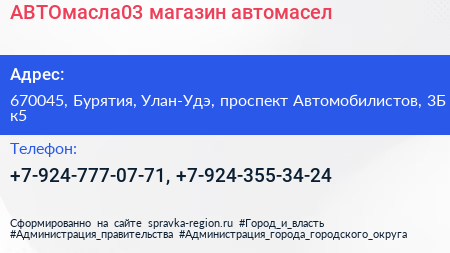 АВТОмасла03, магазин автомасел по адресу 670045, Бурятия, Улан-Удэ, проспект Автомобилистов, 3Б к5 в дальнейшем Организация, размещена в следующих категориях: