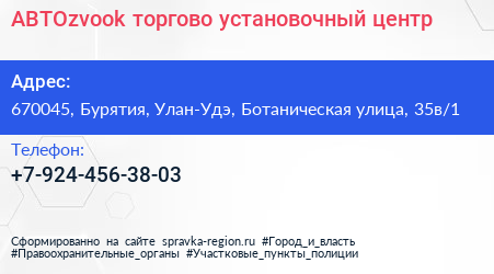 АВТОzvook, торгово-установочный центр по адресу 670045, Бурятия, Улан-Удэ, Ботаническая улица, 35в/1 в дальнейшем Организация, размещена в следующих категориях:
