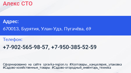 Алекс, СТО по адресу 670013, Бурятия, Улан-Удэ, Пугачёва, 69 в дальнейшем Организация, размещена в следующих категориях: