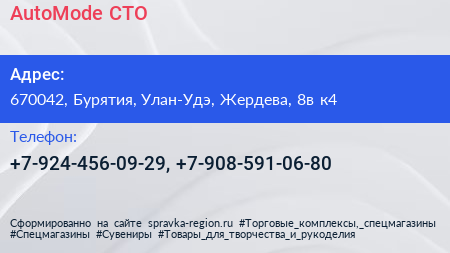 AutoMode, СТО по адресу 670042, Бурятия, Улан-Удэ, Жердева, 8в к4 в дальнейшем Организация, размещена в следующих категориях: