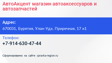 АвтоАкцент, магазин автоаксессуаров и автозапчастей по адресу 670031, Бурятия, Улан-Удэ, Приречная, 17 к1 в дальнейшем Организация, размещена в следующих категориях: