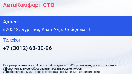 АвтоКомфорт, СТО по адресу 670013, Бурятия, Улан-Удэ, Лебедева, 1 в дальнейшем Организация, размещена в следующих категориях:
