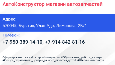 АвтоКонструктор, магазин автозапчастей по адресу 670045, Бурятия, Улан-Удэ, Лимонова, 2Б/1 в дальнейшем Организация, размещена в следующих категориях: