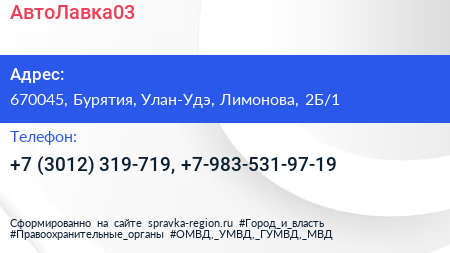АвтоЛавка03 по адресу 670045, Бурятия, Улан-Удэ, Лимонова, 2Б/1 в дальнейшем Организация, размещена в следующих категориях: