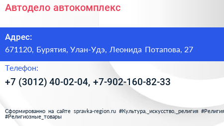 Автодело, автокомплекс по адресу 671120, Бурятия, Улан-Удэ, Леонида Потапова, 27 в дальнейшем Организация, размещена в следующих категориях: