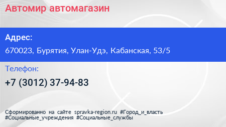 Автомир, автомагазин по адресу 670023, Бурятия, Улан-Удэ, Кабанская, 53/5 в дальнейшем Организация, размещена в следующих категориях: