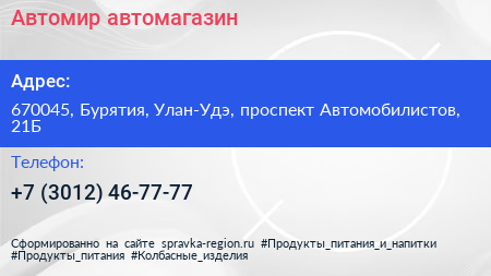 Автомир, автомагазин по адресу 670045, Бурятия, Улан-Удэ, проспект Автомобилистов, 21Б в дальнейшем Организация, размещена в следующих категориях: