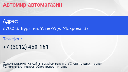 Автомир, автомагазин по адресу 670033, Бурятия, Улан-Удэ, Мокрова, 37 в дальнейшем Организация, размещена в следующих категориях:
