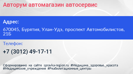 Авторум, автомагазин-автосервис по адресу 670045, Бурятия, Улан-Удэ, проспект Автомобилистов, 21Б в дальнейшем Организация, размещена в следующих категориях: