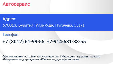 Автосервис по адресу 670013, Бурятия, Улан-Удэ, Пугачёва, 53а/1 в дальнейшем Организация, размещена в следующих категориях: