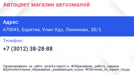 Автоцвет, магазин автоэмалей по адресу 670045, Бурятия, Улан-Удэ, Лимонова, 2Б/1 в дальнейшем Организация, размещена в следующих категориях: