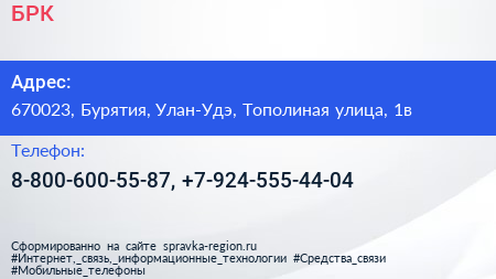 БРК по адресу 670023, Бурятия, Улан-Удэ, Тополиная улица, 1в в дальнейшем Организация, размещена в следующих категориях: