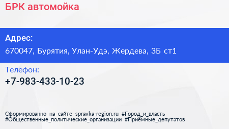 БРК, автомойка по адресу 670047, Бурятия, Улан-Удэ, Жердева, 3Б ст1 в дальнейшем Организация, размещена в следующих категориях: