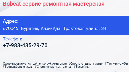 Bobcat сервис, ремонтная мастерская по адресу 670045, Бурятия, Улан-Удэ, Трактовая улица, 34 в дальнейшем Организация, размещена в следующих категориях: