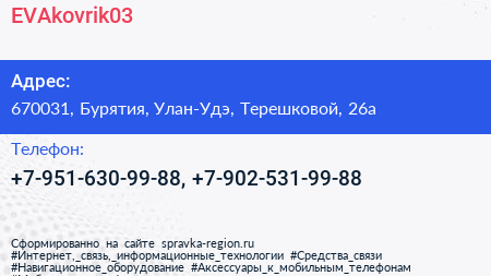 EVAkovrik03 по адресу 670031, Бурятия, Улан-Удэ, Терешковой, 26а в дальнейшем Организация, размещена в следующих категориях: