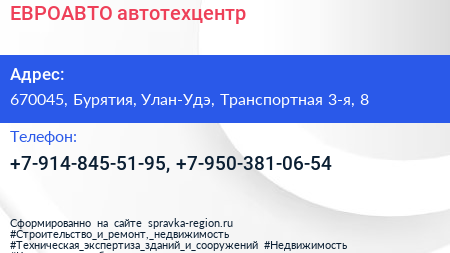 ЕВРОАВТО, автотехцентр по адресу 670045, Бурятия, Улан-Удэ, Транспортная 3-я, 8 в дальнейшем Организация, размещена в следующих категориях: