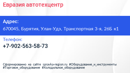 Евразия, автотехцентр по адресу 670045, Бурятия, Улан-Удэ, Транспортная 3-я, 26Б к1 в дальнейшем Организация, размещена в следующих категориях: