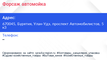 Форсаж, автомойка по адресу 670045, Бурятия, Улан-Удэ, проспект Автомобилистов, 5 к3 в дальнейшем Организация, размещена в следующих категориях: