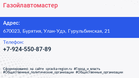 Газойлавтомастер по адресу 670023, Бурятия, Улан-Удэ, Гурульбинская, 21 в дальнейшем Организация, размещена в следующих категориях: