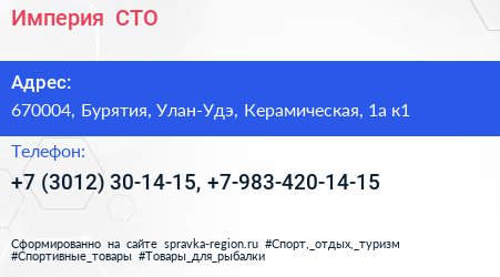Империя+, СТО по адресу 670004, Бурятия, Улан-Удэ, Керамическая, 1а к1 в дальнейшем Организация, размещена в следующих категориях: