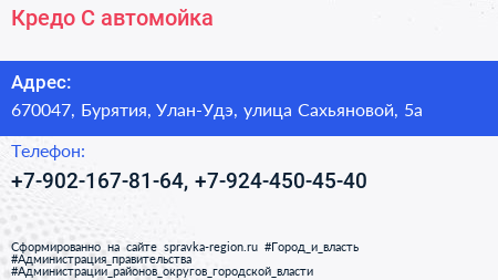 Кредо-С, автомойка по адресу 670047, Бурятия, Улан-Удэ, улица Сахьяновой, 5а в дальнейшем Организация, размещена в следующих категориях:
