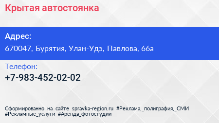 Крытая автостоянка по адресу 670047, Бурятия, Улан-Удэ, Павлова, 66а в дальнейшем Организация, размещена в следующих категориях: