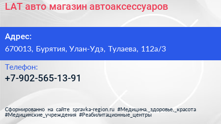 LAT-авто, магазин автоаксессуаров по адресу 670013, Бурятия, Улан-Удэ, Тулаева, 112а/3 в дальнейшем Организация, размещена в следующих категориях: