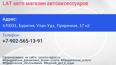 LAT-авто, магазин автоаксессуаров по адресу 670031, Бурятия, Улан-Удэ, Приречная, 17 к2 в дальнейшем Организация, размещена в следующих категориях: