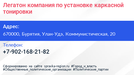 Легатон, компания по установке каркасной тонировки по адресу 670000, Бурятия, Улан-Удэ, Коммунистическая, 20 в дальнейшем Организация, размещена в следующих категориях: