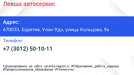 Левша, автосервис по адресу 670033, Бурятия, Улан-Удэ, улица Кольцова, 9а в дальнейшем Организация, размещена в следующих категориях: