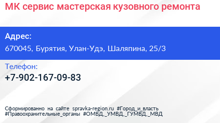 МК-сервис, мастерская кузовного ремонта по адресу 670045, Бурятия, Улан-Удэ, Шаляпина, 25/3 в дальнейшем Организация, размещена в следующих категориях: