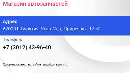 Магазин автозапчастей по адресу 670031, Бурятия, Улан-Удэ, Приречная, 17 к2 в дальнейшем Организация, размещена в следующих категориях: