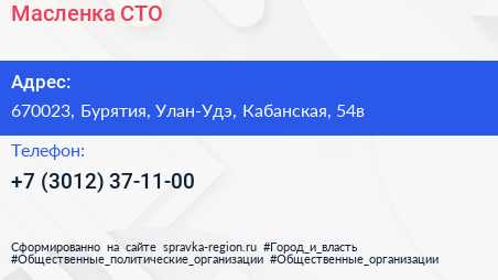 Масленка, СТО по адресу 670023, Бурятия, Улан-Удэ, Кабанская, 54в в дальнейшем Организация, размещена в следующих категориях: