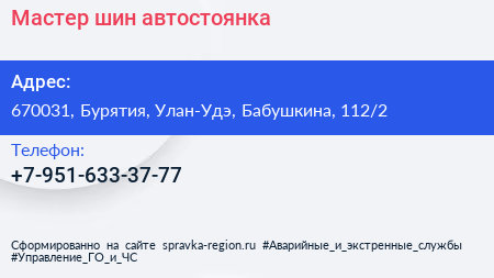 Мастер шин, автостоянка по адресу 670031, Бурятия, Улан-Удэ, Бабушкина, 112/2 в дальнейшем Организация, размещена в следующих категориях: