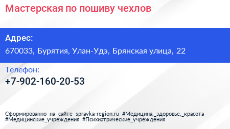 Мастерская по пошиву чехлов по адресу 670033, Бурятия, Улан-Удэ, Брянская улица, 22 в дальнейшем Организация, размещена в следующих категориях: