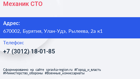 Механик, СТО по адресу 670002, Бурятия, Улан-Удэ, Рылеева, 2а к1 в дальнейшем Организация, размещена в следующих категориях: