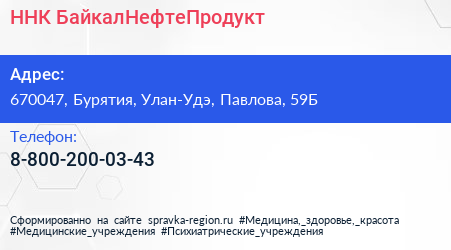 ННК-БайкалНефтеПродукт по адресу 670047, Бурятия, Улан-Удэ, Павлова, 59Б в дальнейшем Организация, размещена в следующих категориях: