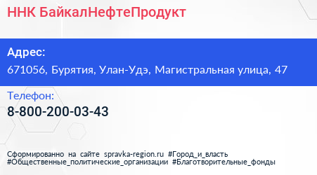 ННК-БайкалНефтеПродукт по адресу 671056, Бурятия, Улан-Удэ, Магистральная улица, 47 в дальнейшем Организация, размещена в следующих категориях: