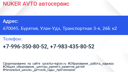 NUKER AVTO, автосервис по адресу 670045, Бурятия, Улан-Удэ, Транспортная 3-я, 26Б к2 в дальнейшем Организация, размещена в следующих категориях: