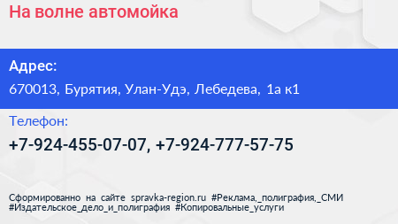 На волне, автомойка по адресу 670013, Бурятия, Улан-Удэ, Лебедева, 1а к1 в дальнейшем Организация, размещена в следующих категориях: