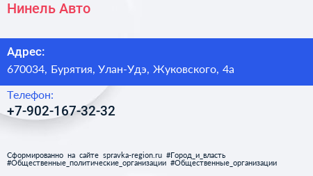 Нинель Авто по адресу 670034, Бурятия, Улан-Удэ, Жуковского, 4а в дальнейшем Организация, размещена в следующих категориях:
