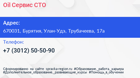Oil-Сервис, СТО по адресу 670031, Бурятия, Улан-Удэ, Трубачеева, 17а в дальнейшем Организация, размещена в следующих категориях: