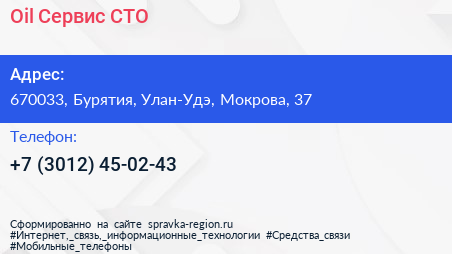 Oil-Сервис, СТО по адресу 670033, Бурятия, Улан-Удэ, Мокрова, 37 в дальнейшем Организация, размещена в следующих категориях: