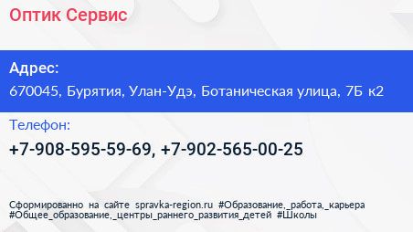 Оптик Сервис по адресу 670045, Бурятия, Улан-Удэ, Ботаническая улица, 7Б к2 в дальнейшем Организация, размещена в следующих категориях: