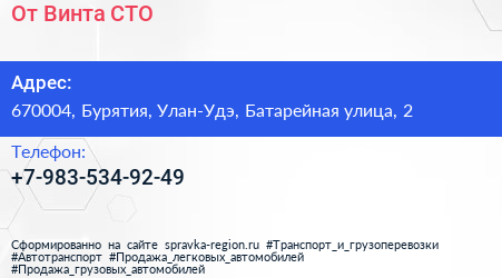 От Винта, СТО по адресу 670004, Бурятия, Улан-Удэ, Батарейная улица, 2 в дальнейшем Организация, размещена в следующих категориях: